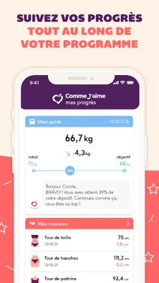 Desbloquee su potencial de bienestar con COMME J'AIME, la aplicación definitiva que complementa y potencia su programa de reequilibrio alimentario. Diseñada como su compañero digital más confiable, COMME J'AIME es el soporte indispensable para quienes buscan transformar su camino hacia la pérdida de peso y una vida más saludable. Imagine ver su futuro progreso con nuestra curva predictiva de pérdida de peso, una innovadora característica que le ofrece una visión clara del recorrido por delante. Junto a ella, un seguimiento detallado de su peso, IMC y todas sus medidas corporales le proporcionará datos precisos para celebrar cada logro.